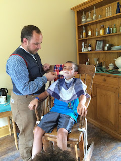 | This barber was a great performer at Heritage Park. Olivia was really afraid he was going to draw her blood. |